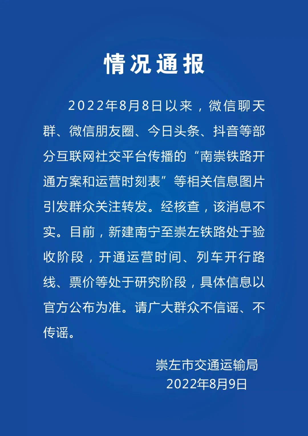 8月9日,記者從崇左市交通運(yùn)輸局了解到,經(jīng)該局核查,該消息不實(shí)。目前,新建南寧至崇左鐵路處于驗(yàn)收階段,開通運(yùn)營(yíng)時(shí)間、列車開行路線、票價(jià)等處于研究階段,具體信息以官方公布為準(zhǔn)。請(qǐng)廣大群眾不信謠、不傳謠。