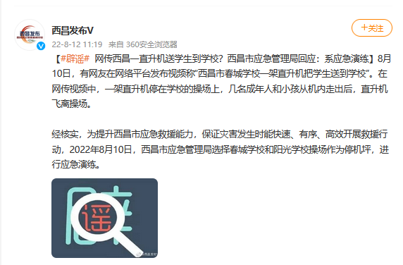 經(jīng)核實(shí),為提升西昌市應(yīng)急救援能力,保證災(zāi)害發(fā)生時(shí)能快速、有序、高效開展救援行動(dòng),2022年8月10日,西昌市應(yīng)急管理局選擇春城學(xué)校和陽光學(xué)校操場(chǎng)作為停機(jī)坪,進(jìn)行應(yīng)急演練。