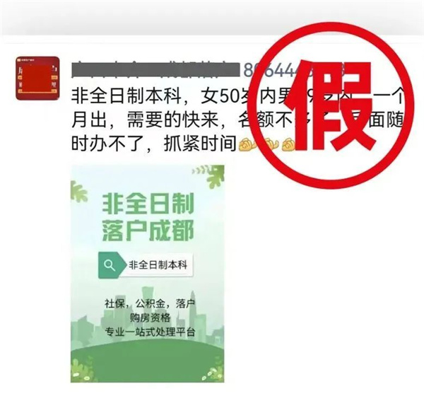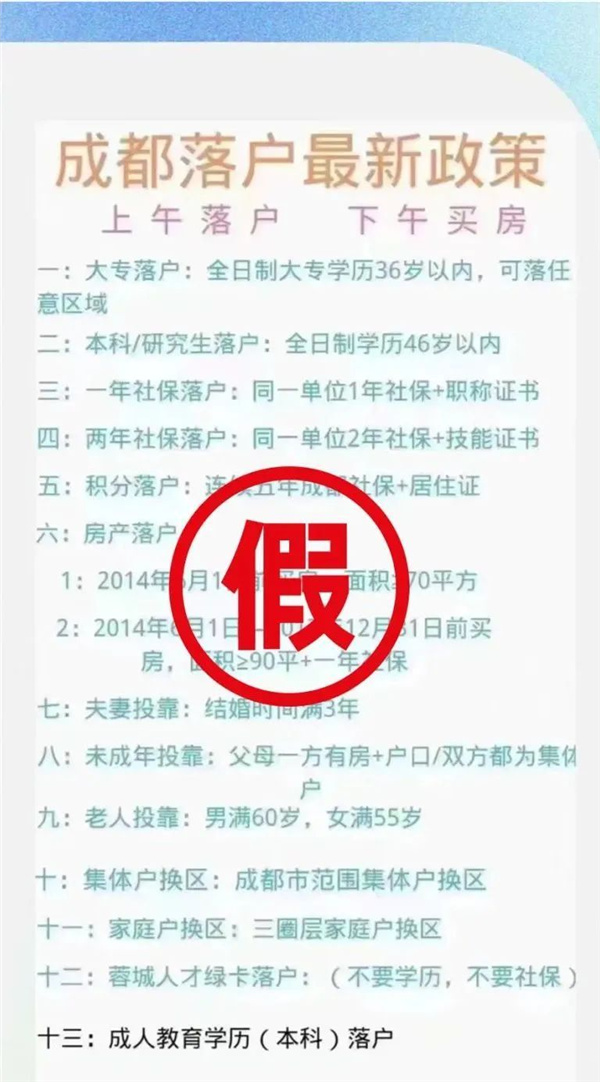 近期,網(wǎng)上一則關(guān)于“成都落戶最新政策”的圖文信息在網(wǎng)絡(luò)平臺傳播,內(nèi)容稱“非全日制本科也可以落戶成都了、函授本科、成人教育、自考本科、網(wǎng)絡(luò)教育全部可以落戶成都,有房落房,無房落集體戶”,相關(guān)信息引發(fā)關(guān)注和討論,部分網(wǎng)民誤以為成都又出新政,非全日制本科可通過學(xué)歷落戶成都。