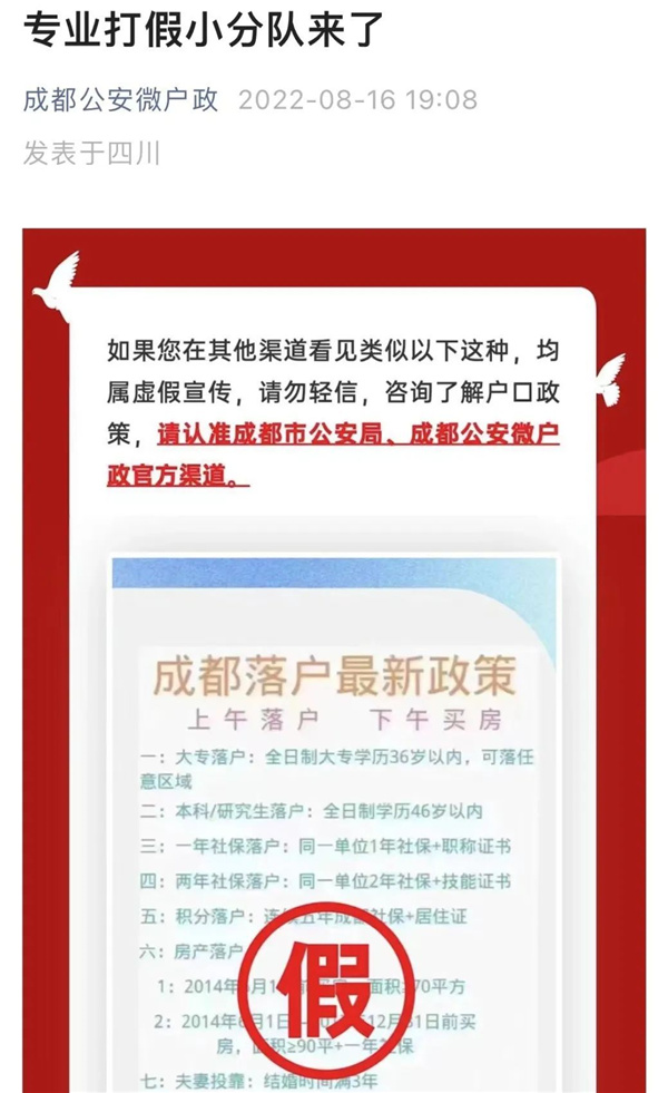 對此,8月16日“成都公安微戶政”官微發(fā)布信息表示,此類信息均屬虛假宣傳,請勿輕信。咨詢了解戶口政策,請認(rèn)準(zhǔn)成都市公安局、成都公安微戶政官方渠道。