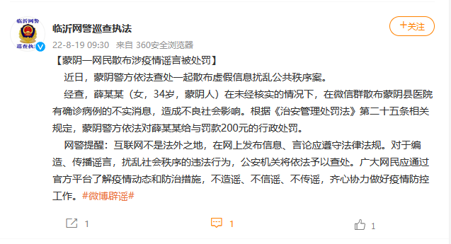 經(jīng)查,薛某某(女,34歲,蒙陰人)在未經(jīng)核實(shí)的情況下,在微信群散布蒙陰縣醫(yī)院有確診病例的不實(shí)消息,造成不良社會(huì)影響。根據(jù)《治安管理處罰法》第二十五條相關(guān)規(guī)定,蒙陰警方依法對(duì)薛某某給與罰款200元的行政處罰。
