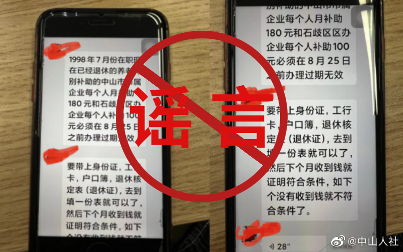 近日,中山市社保經(jīng)辦部門發(fā)現(xiàn)部分微信群中流傳一則“必須在8月25日前辦理養(yǎng)老補貼補助”的消息。經(jīng)核實,該消息內(nèi)容不實,為謠傳。中山市并未發(fā)布此類辦理信息,并未設(shè)置上述辦理時限。