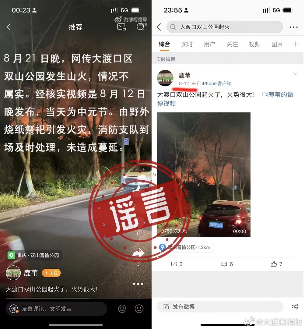有網(wǎng)友稱,8月21日晚大渡口區(qū)雙山公園發(fā)生大火,引起市民關(guān)注。經(jīng)核實(shí)該消息不屬實(shí)。文中視頻為8月12日(中元節(jié))晚,由野外燒紙祭祀引發(fā)火災(zāi),消防支隊(duì)到場及時(shí)處理,未造成蔓延。 ???