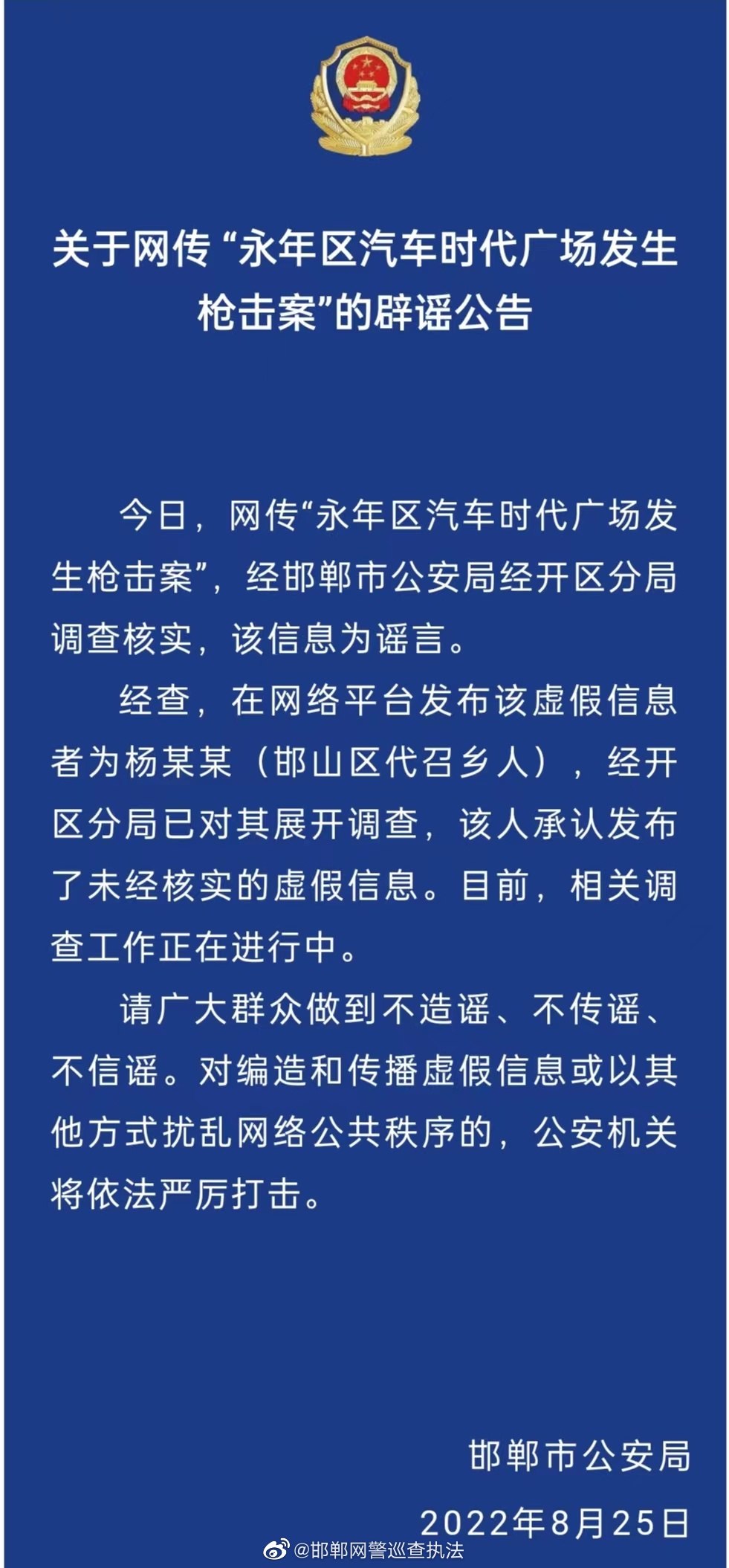 8月25日,網(wǎng)傳“永年區(qū)汽車時(shí)代廣場(chǎng)發(fā)生槍擊案”,經(jīng)邯鄲市公安局經(jīng)開(kāi)區(qū)分局調(diào)查核實(shí),該信息為謠言。