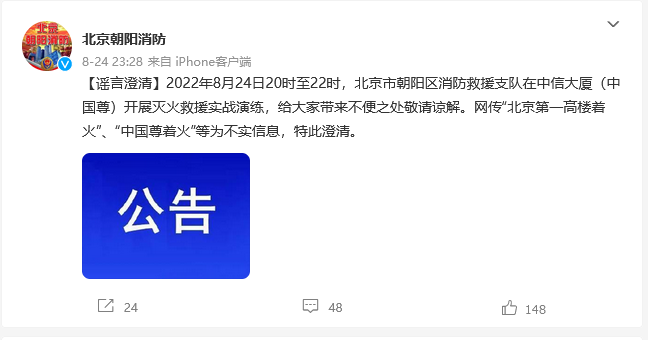 2022年8月24日20時至22時,北京市朝陽區(qū)消防救援支隊在中信大廈(中國尊)開展滅火救援實戰(zhàn)演練,給大家?guī)聿槐阒幘凑堈徑?。網(wǎng)傳“北京第一高樓著火”、“中國尊著火”等為不實信息,特此澄清。 ???