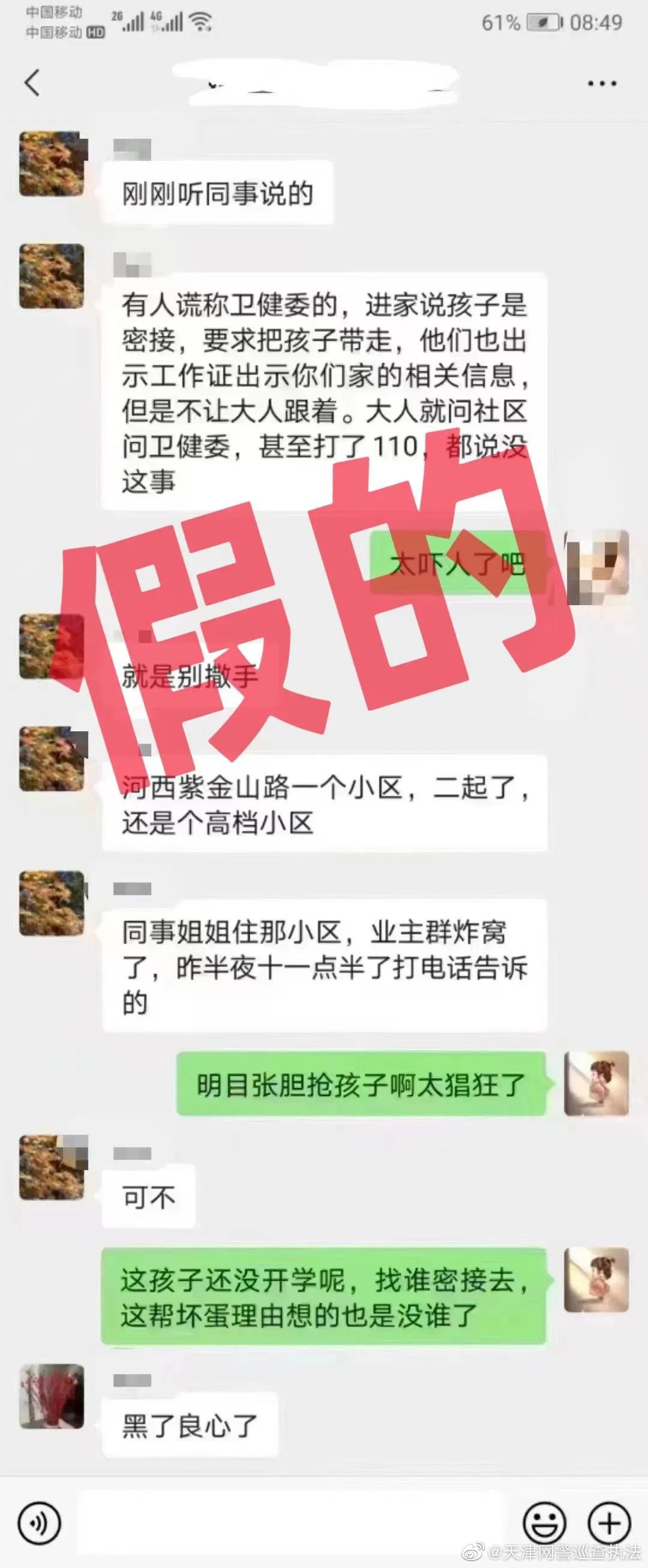 8月30日,接到網(wǎng)民舉報(bào),天津市河西區(qū)有居民在微信群發(fā)布消息稱,“有人謊稱衛(wèi)健委的,進(jìn)家說(shuō)孩子是密接,要求把孩子帶走,……。”