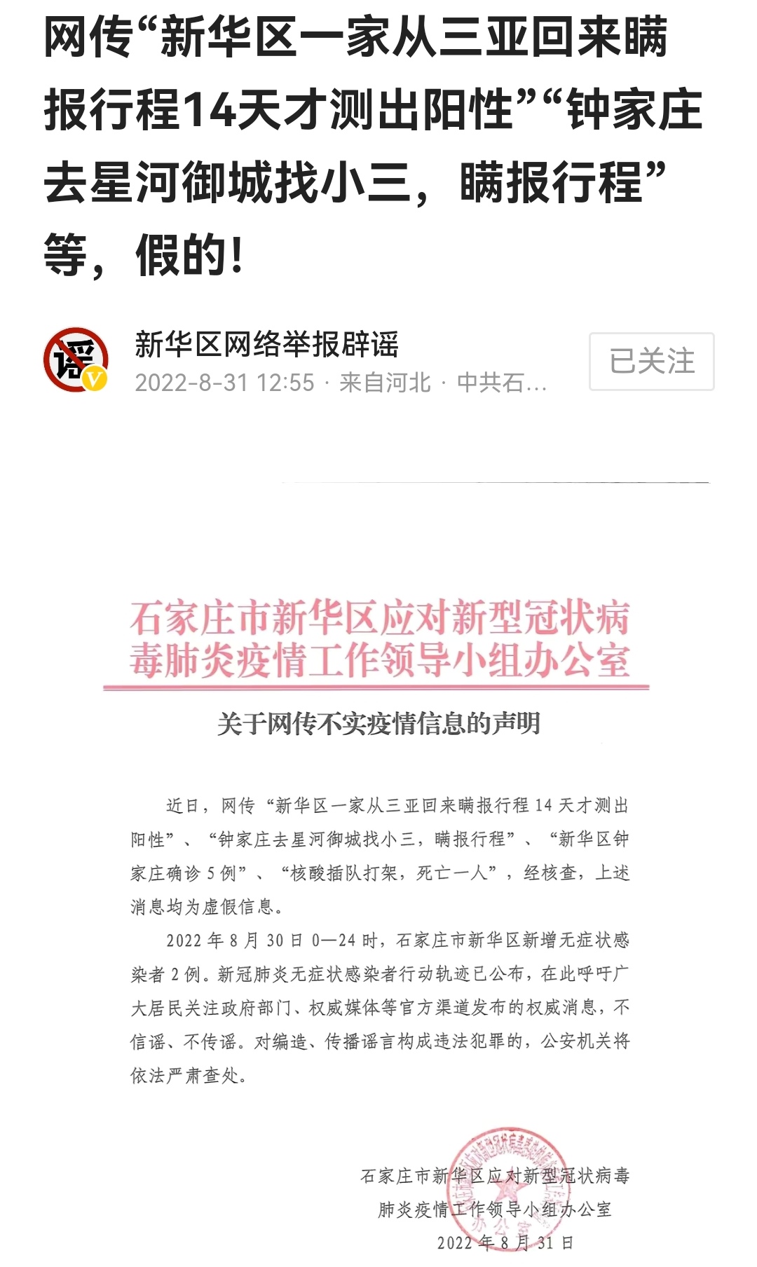 8月31日,石家莊市新華區(qū)應(yīng)對(duì)新型冠狀病毒肺炎疫情工作領(lǐng)導(dǎo)小組辦公室發(fā)布聲明,近日,網(wǎng)傳“新華區(qū)一家從三亞回來(lái)瞞報(bào)行程14天才測(cè)出陽(yáng)性”“鐘家莊去星河御城找小三,瞞報(bào)行程”“新華區(qū)鐘家莊確診5例”“核酸插隊(duì)打架,死亡一人”,經(jīng)核查,上述消息均為虛假信息。