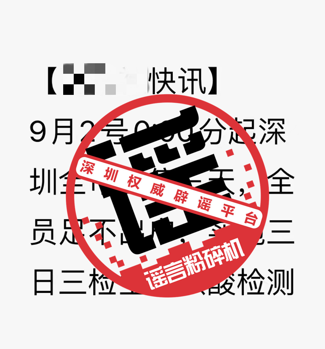 9月1日,在部分深圳市民的微信群里流傳一張某媒體快訊截圖,寫有“9月2日0:00分起深圳全市暫停三天,全員足不出戶,實(shí)施三日三檢全員核酸檢測”字樣。經(jīng)核實(shí),此為對深圳部分區(qū)新型冠狀病毒肺炎疫情防控指揮部通告的嚴(yán)重誤讀。