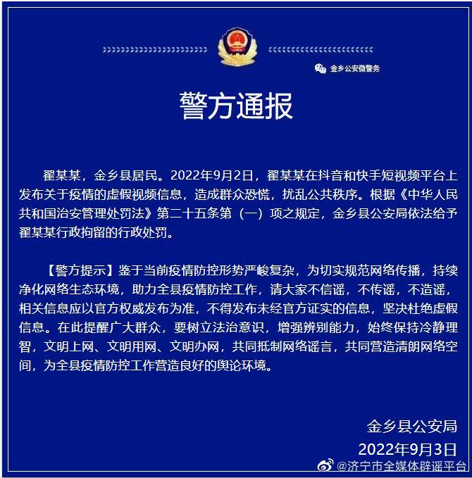 9月3日,金鄉(xiāng)縣公安局發(fā)布通報稱,居民翟某某9月2日在抖音和快手短視頻平臺上發(fā)布關于疫情的虛假視頻信息,造成群眾恐慌,擾亂公共秩序。根據《中華人民共和國治安管理處罰法》第二十五條第(一)項之規(guī)定,金鄉(xiāng)縣公安局依法給予翟某某行政拘留的行政處罰。