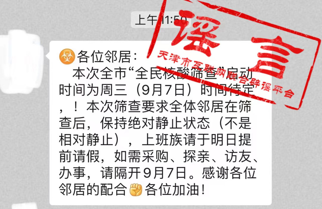 經(jīng)核實(shí),此為謠言信息,天津市尚未有9月7日開(kāi)展全市全員核酸檢測(cè)的計(jì)劃。不造謠、不信謠、不傳謠,及時(shí)關(guān)注官方權(quán)威消息,不傳播未經(jīng)證實(shí)信息,共同維護(hù)清朗網(wǎng)絡(luò)環(huán)境。