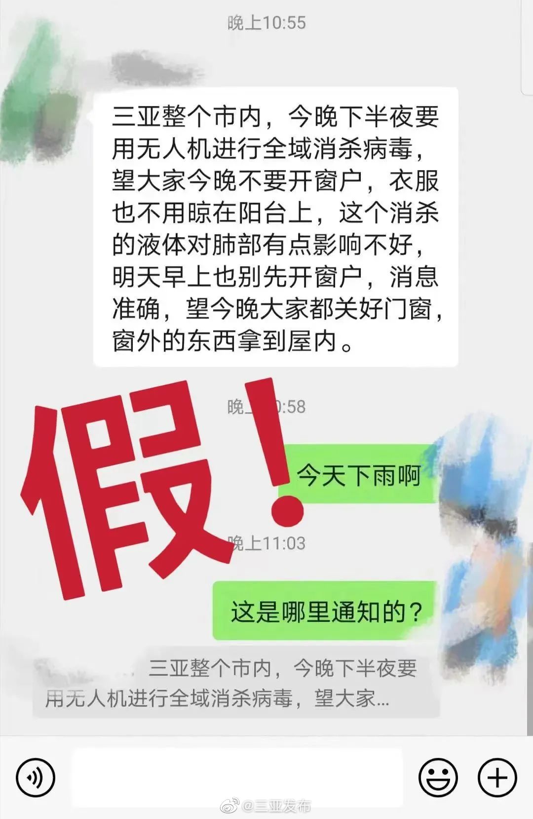 日前,有消息在三亞市民微信群中流傳稱三亞將于深夜采用無人機對全市進行消殺,經(jīng)核實,此為假消息! ???