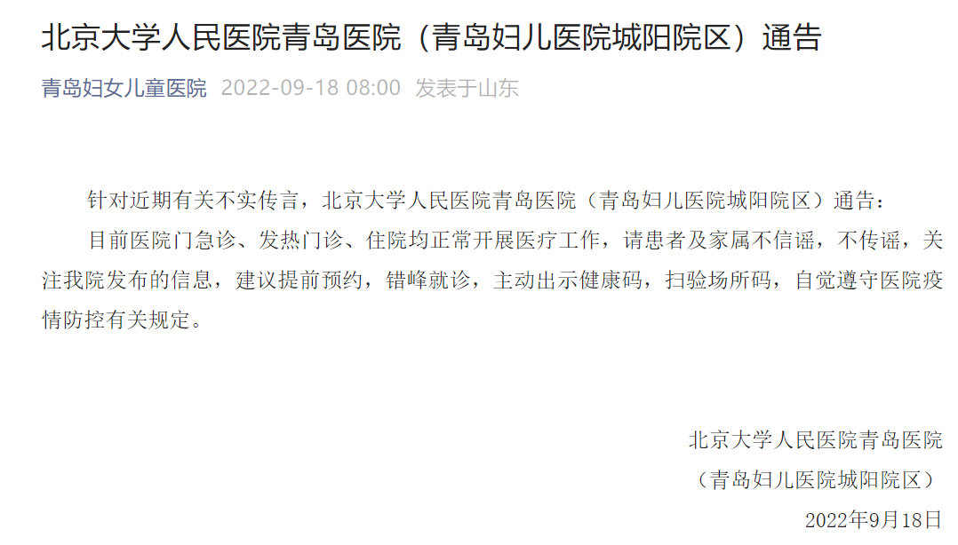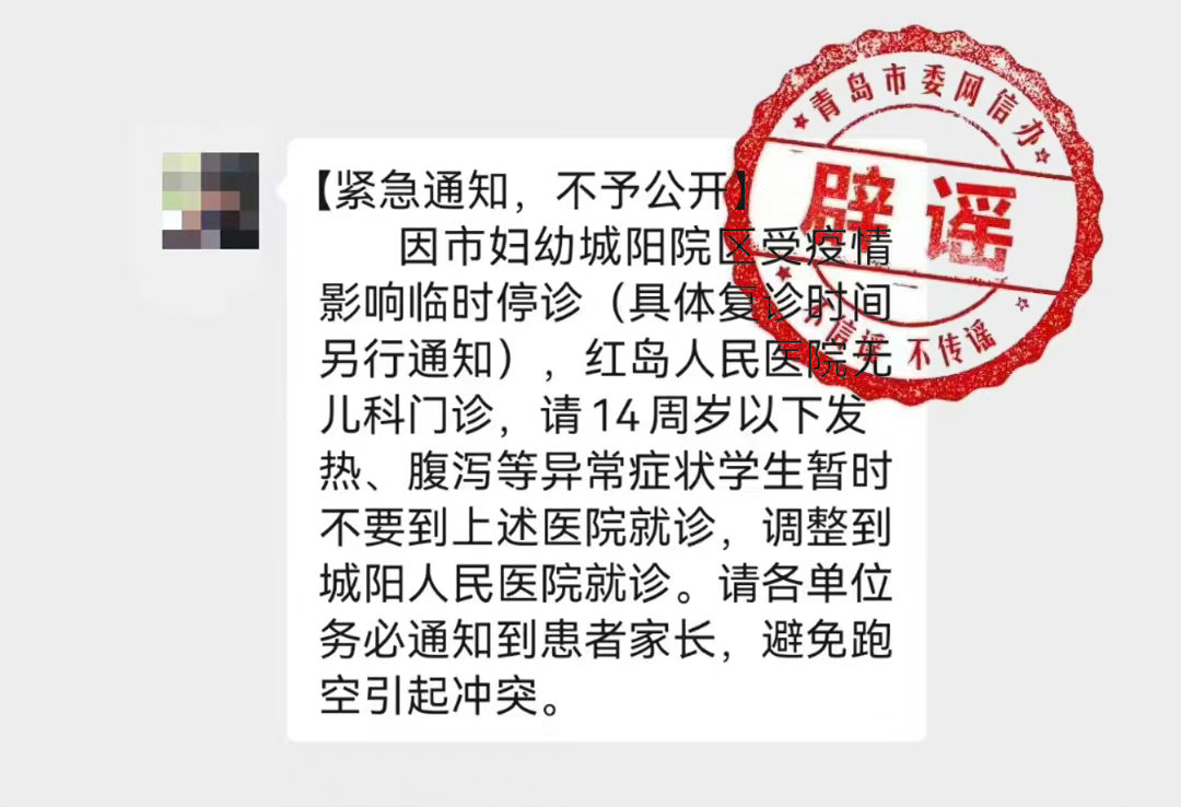 近日,“青島市婦幼城陽院區(qū)受疫情影響臨時停診”的消息在青島本地網(wǎng)絡傳播。對此,青島婦女兒童醫(yī)院微信公眾號于9月18日上午發(fā)布辟謠通告稱,目前醫(yī)院門急診、發(fā)熱門診、住院均正常開展醫(yī)療工作,請患者及家屬不信謠,不傳謠。