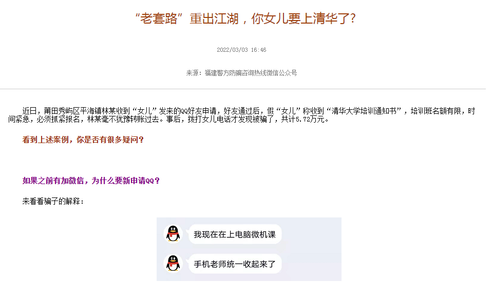 經(jīng)福建辟謠平臺記者排查,此類謠言并非首次出現(xiàn),近年來已多次通過不同形式在各地傳播。例如晉城市政法委員會在2021年6月就曾發(fā)布公告稱,網(wǎng)傳“清華大學(xué)”通知書是假的,騙子通過非法手段盜取受害人QQ號,然后冒充受害人向其父母發(fā)送虛假培訓(xùn)通知書,以此來騙取培訓(xùn)費?! ?/p>