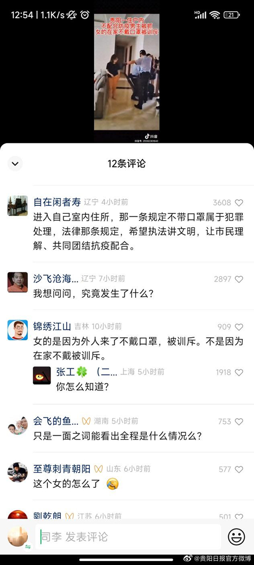 “進(jìn)入自己室內(nèi)住所,哪一條規(guī)定不戴口罩屬于犯罪處理,法律那條規(guī)定,希望執(zhí)法講文明,讓市民理解、共同團(tuán)結(jié)抗疫配合。”“只是一面之詞能看出全程是什么情況么?”對(duì)于事件本身,視頻評(píng)論區(qū)的網(wǎng)友發(fā)表了不同的看法。