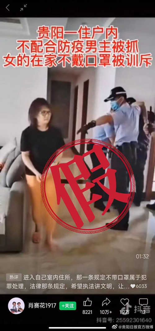 近日,一段公安民警上門抓人的視頻在朋友圈流傳,視頻中,幾名民警在居民家中對(duì)違法者進(jìn)行搜身。作者還在視頻中打出“貴陽(yáng)一住戶內(nèi)不配合防疫,男主被抓,女的在家里不戴口罩被訓(xùn)斥”等醒目字樣,引發(fā)網(wǎng)友的關(guān)注和轉(zhuǎn)發(fā)。