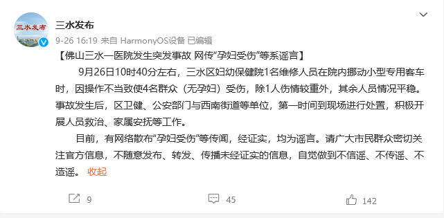 9月26日10時(shí)40分左右,三水區(qū)婦幼保健院1名維修人員在院內(nèi)挪動(dòng)小型專用客車時(shí),因操作不當(dāng)致使4名群眾(無孕婦)受傷,除1人傷情較重外,其余人員情況平穩(wěn)。事故發(fā)生后,區(qū)衛(wèi)健、公安部門與西南街道等單位,第一時(shí)間到現(xiàn)場(chǎng)進(jìn)行處置,積極開展人員救治、家屬安撫等工作。