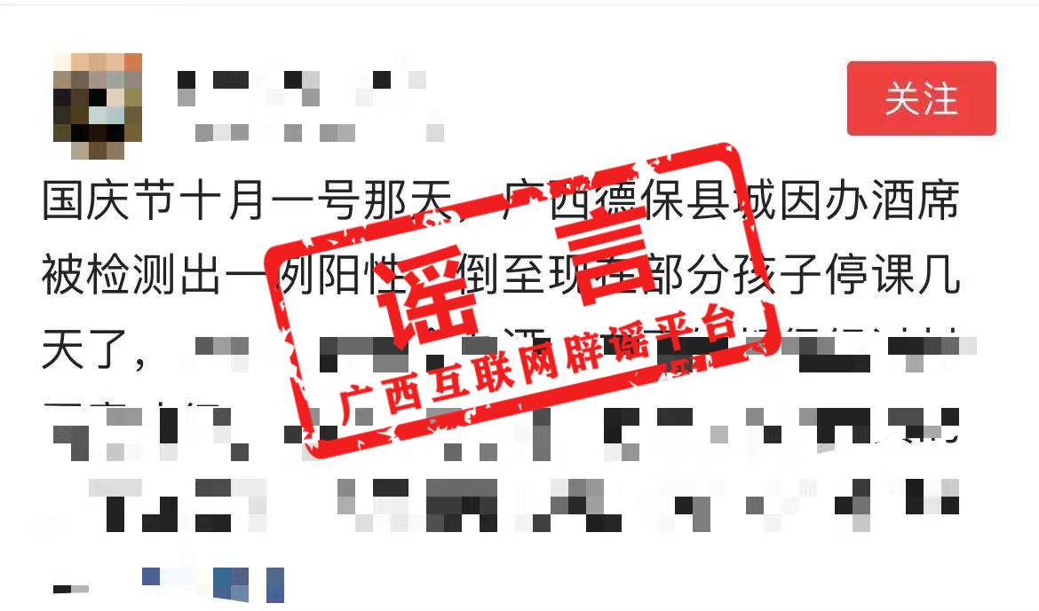 近日,一名網(wǎng)友在社交媒體上發(fā)表文字和圖片稱,“十月一日那天,廣西百色德??h因辦酒席被檢測(cè)出一例陽(yáng)性”。經(jīng)百色市委網(wǎng)信辦向德保縣疫情防控指揮部核實(shí),該信息不實(shí)。自治區(qū)衛(wèi)健委未發(fā)布百色德保縣發(fā)生疫情相關(guān)信息。