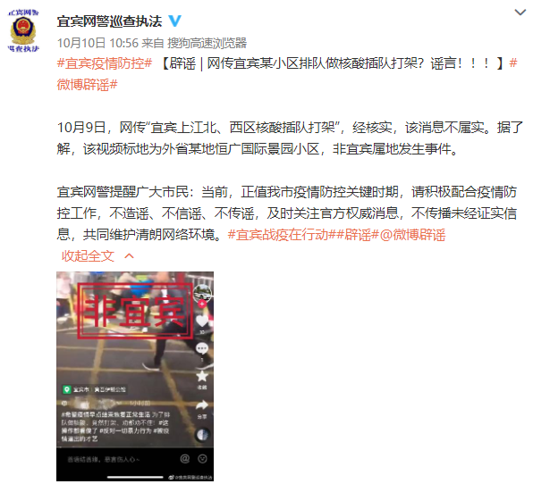 10月10日,@宜賓網(wǎng)警巡查執(zhí)法 發(fā)布消息稱,10月9日,網(wǎng)傳“宜賓上江北、西區(qū)核酸插隊(duì)打架”,經(jīng)核實(shí),該消息不屬實(shí)。
