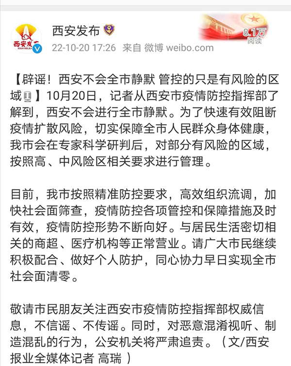 敬請(qǐng)市民朋友關(guān)注西安市疫情防控指揮部權(quán)威信息,不信謠、不傳謠。同時(shí),對(duì)惡意混淆視聽、制造混亂的行為,公安機(jī)關(guān)將嚴(yán)肅追責(zé)。