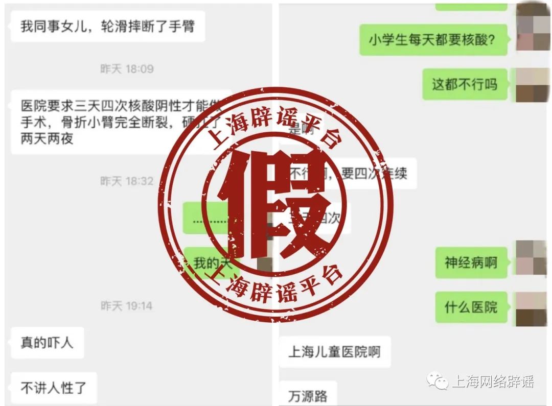 近日,微信圈群流傳一段聊天記錄,稱同事女兒因滑輪滑摔斷手臂,“醫(yī)院要求三天四次核酸陰性才能做手術(shù),骨折小臂完全斷裂,硬抗了兩天兩夜”。還稱此事發(fā)生在萬源路上的“上海兒童醫(yī)院”。上海辟謠平臺(tái)多方求證,該傳言為不實(shí)信息。