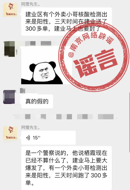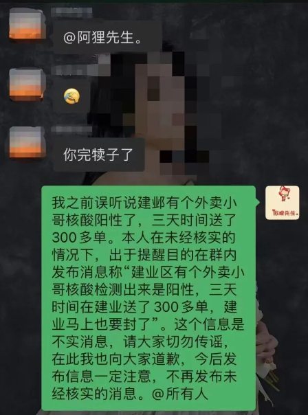 11月3日,微信群流傳一則消息,內(nèi)容提到“建鄴區(qū)有外賣小哥核酸陽性,三天跑了300多單,建鄴馬上要大爆發(fā)”。相關消息引起很多網(wǎng)民的關注和擔憂。