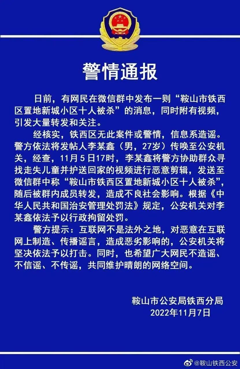 經(jīng)核實(shí),鐵西區(qū)無此案件或警情,信息系造謠。警方依法將發(fā)帖人李某鑫(男,27歲)傳喚至公安機(jī)關(guān),經(jīng)查,11月5日17時(shí),李某鑫將警方協(xié)助群眾尋找走失兒童并護(hù)送回家的視頻進(jìn)行惡意剪輯,發(fā)送至微信群中稱“鞍山市鐵西區(qū)置地新城小區(qū)十人被殺”,隨后被群內(nèi)成員轉(zhuǎn)發(fā),造成不良社會(huì)影響。根據(jù)《中華人民共和國治安管理處罰法》規(guī)定,公安機(jī)關(guān)對李某鑫依法予以行政拘留處罰。