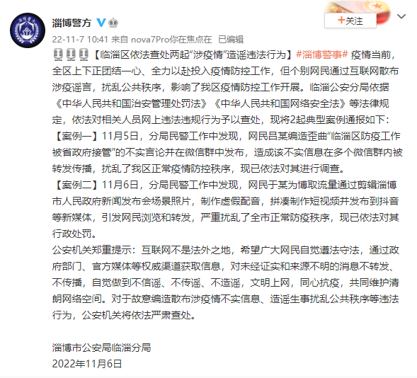 近日,山東省淄博市公安局依法查處兩起“涉疫情”造謠違法行為。詳情如下:
