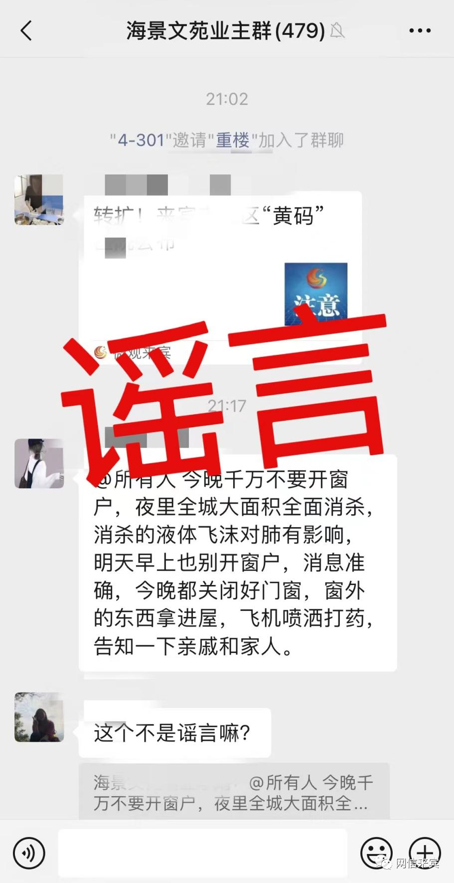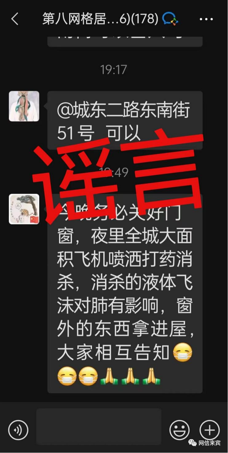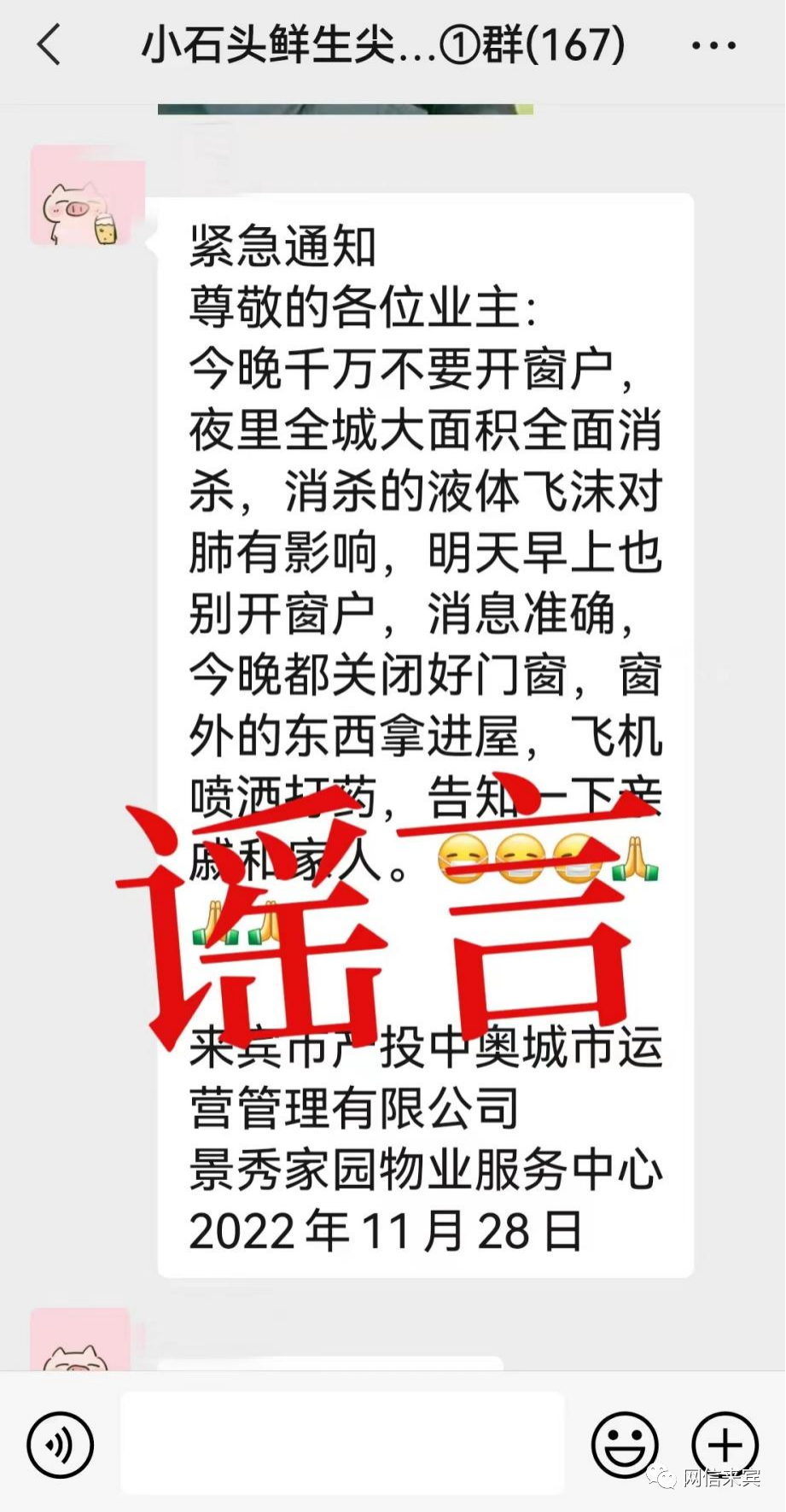經(jīng)相關(guān)部門核實,興賓區(qū)沒有計劃開展大面積消殺工作,微信群傳播“今晚千萬不要開窗戶,夜里全城大面積全面消殺,消殺的液體飛沫對肺有影響,明天早上也別開窗戶,消息準(zhǔn)確,今晚都關(guān)閉好門窗,窗外的東西拿進屋,飛機噴灑打藥,告知一下親戚和家人。”信息不實。