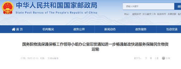 ??12月15日,國(guó)務(wù)院物流保通保暢工作領(lǐng)導(dǎo)小組辦公室印發(fā)《關(guān)于進(jìn)一步暢通郵政快遞服務(wù)保障民生物資運(yùn)輸?shù)耐ㄖ访鞔_指出,各地物流保通保暢工作機(jī)制要全力打通郵政快遞堵點(diǎn)卡點(diǎn);要加強(qiáng)對(duì)當(dāng)?shù)剜]政管理部門與相關(guān)部門的指導(dǎo),統(tǒng)籌動(dòng)員各方資源,細(xì)化入微各項(xiàng)舉措,科學(xué)精準(zhǔn)做好郵政快遞保通保暢工作,保障郵件快件攬收投遞順暢,切實(shí)暢通郵政快遞末端“微循環(huán)”。
