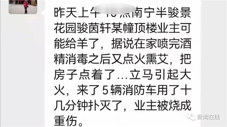 根據(jù)網(wǎng)圖流傳的信息顯示,在南寧一個(gè)名為駿景花園駿茵軒的小區(qū),某幢頂樓住戶可能“陽”了,住戶在家噴完酒精消毒之后,又點(diǎn)火熏艾,結(jié)果引起大火,業(yè)主被燒成重傷。但是,記者核實(shí)后發(fā)現(xiàn),在南寧并沒有同名小區(qū),即便是名字類似的小區(qū),其建筑外立面也完全不同。