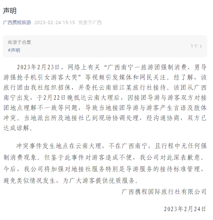 2月24日,廣西攜程國際旅行社有限公司發(fā)布聲明: