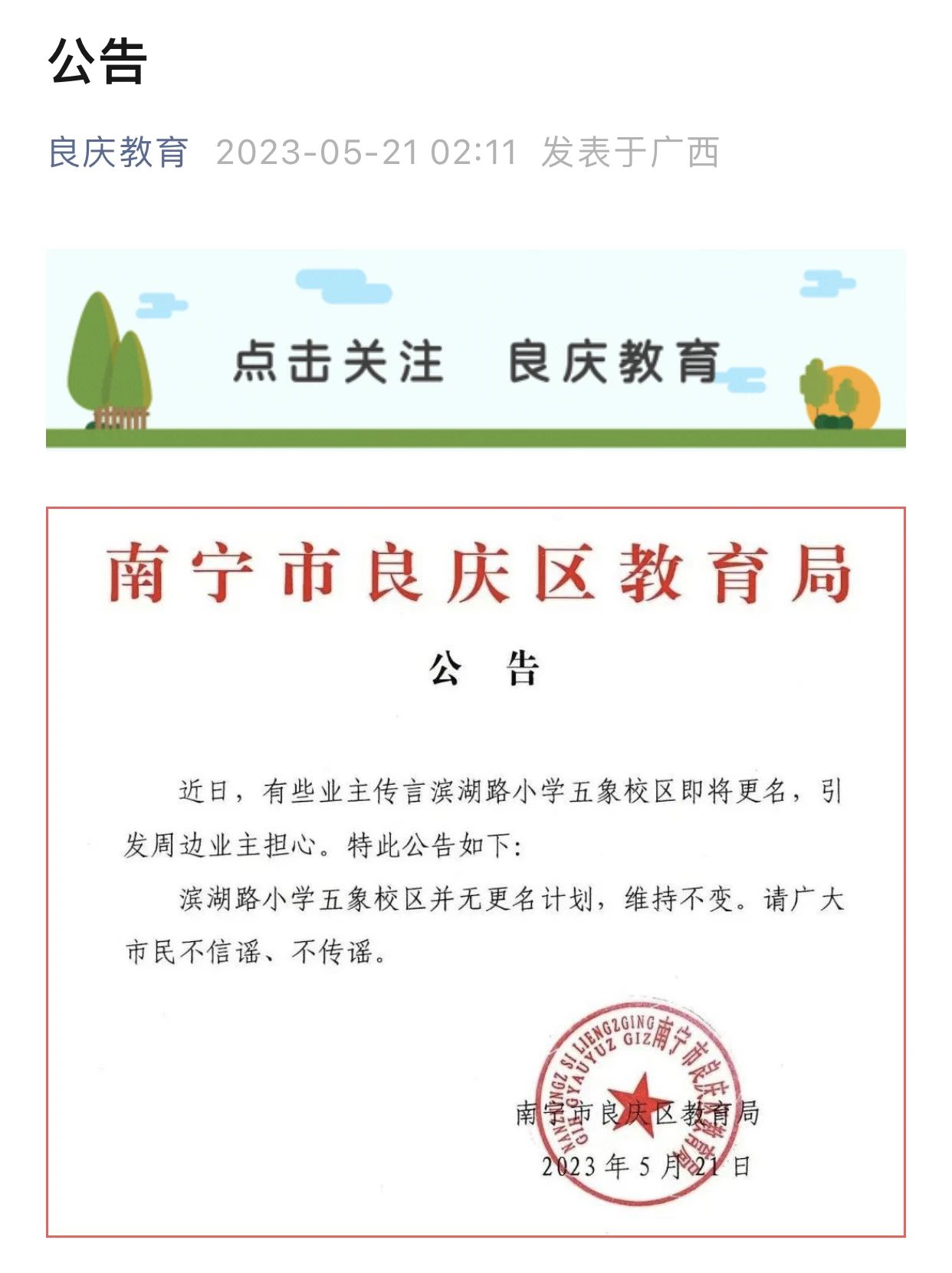 濱湖路小學五象校區(qū)并無更名計劃,維持不變。請廣大市民不信謠、不傳謠。