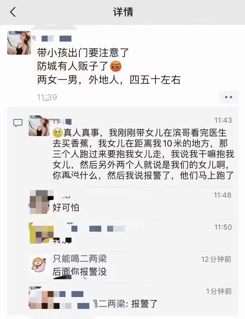 近日,防城港市公安局網(wǎng)安部門在工作中發(fā)現(xiàn),有網(wǎng)民在微信朋友圈發(fā)布消息稱“帶小孩出門要注意了,防城有人販子了,兩女一男,外地人”,還自我評論稱這是其女兒在防城區(qū)人民路兵哥診所附近差點被三個人販子搶走的真人真事。