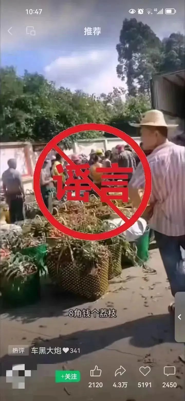 經查,抖音賬號“大*哥”、微信視頻號賬號“裴**”分別發(fā)布視頻稱:欽州的荔枝爛市,8毛錢一斤都沒人要。兩個視頻定位在欽州,且內容虛假,惡意誤導輿論,短短時間內造成了數(shù)以萬計的轉發(fā)瀏覽,擾亂社會秩序,社會影響極其惡劣。為此,欽南區(qū)迅速開展調查取證工作,經查實,兩個視頻分別為轄區(qū)居民李某、裴某某所發(fā),到案后,李某、裴某某均認識到自己的行為錯誤,對編造、散布虛假信息的違法行為供認不諱。當天,公安機關根據《中華人民共和國治安管理處罰法》相關規(guī)定,分別對李某、裴某某的違法行為依法作出行政處罰。