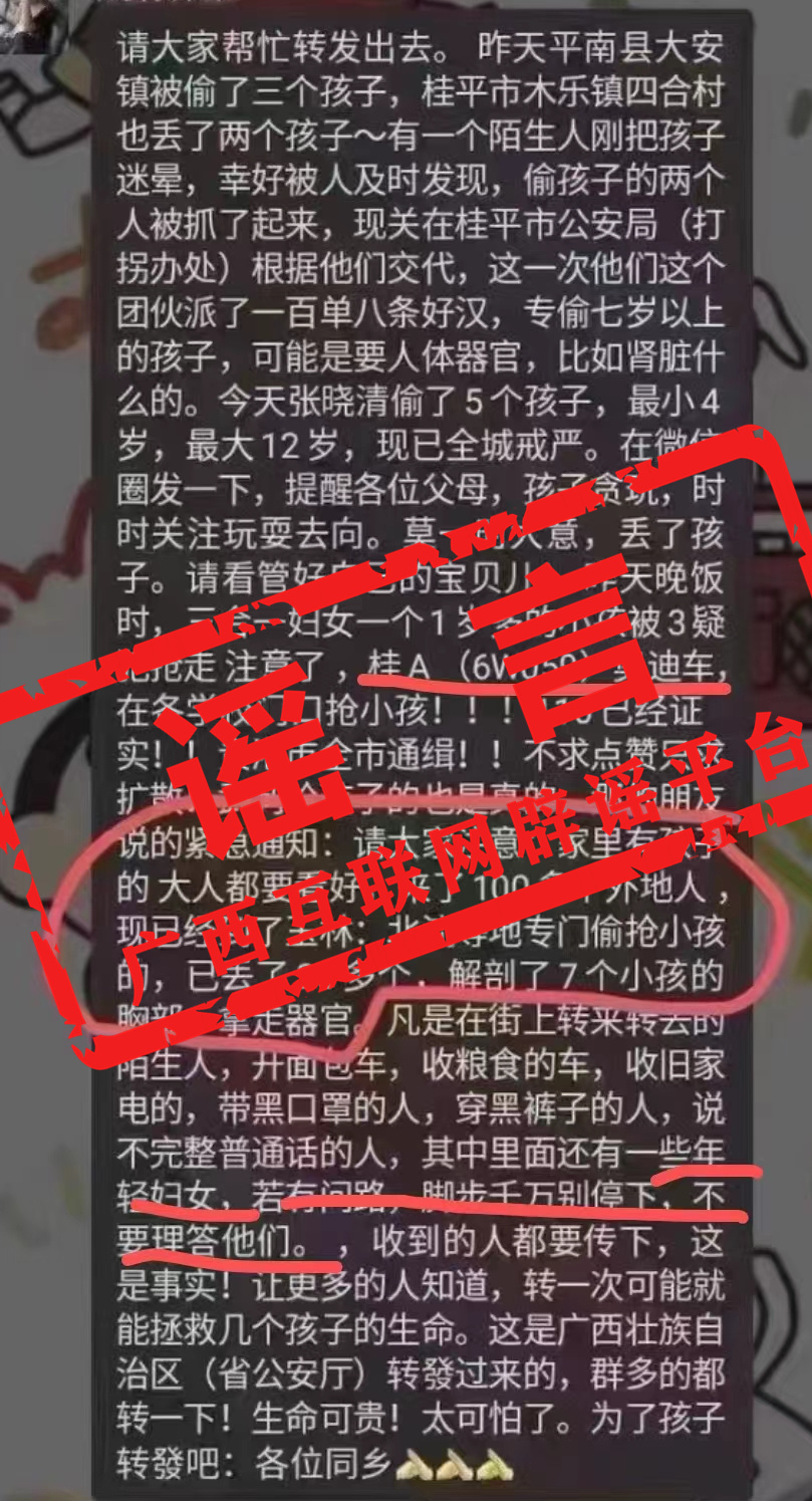 近日,網(wǎng)絡(luò)上出現(xiàn)我區(qū)一些地方小孩被偷去摘器官、被騙去緬甸等傳言。