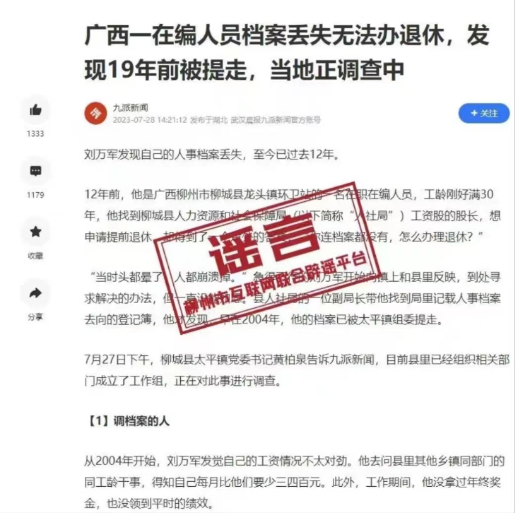 2023年7月28日,有網(wǎng)友反映“廣西一在編人員檔案丟失無法辦理退休,發(fā)現(xiàn)19年前被提走,當(dāng)?shù)卣谡{(diào)查中”的情況,柳城縣高度重視,立即對(duì)相關(guān)情況進(jìn)行核查。