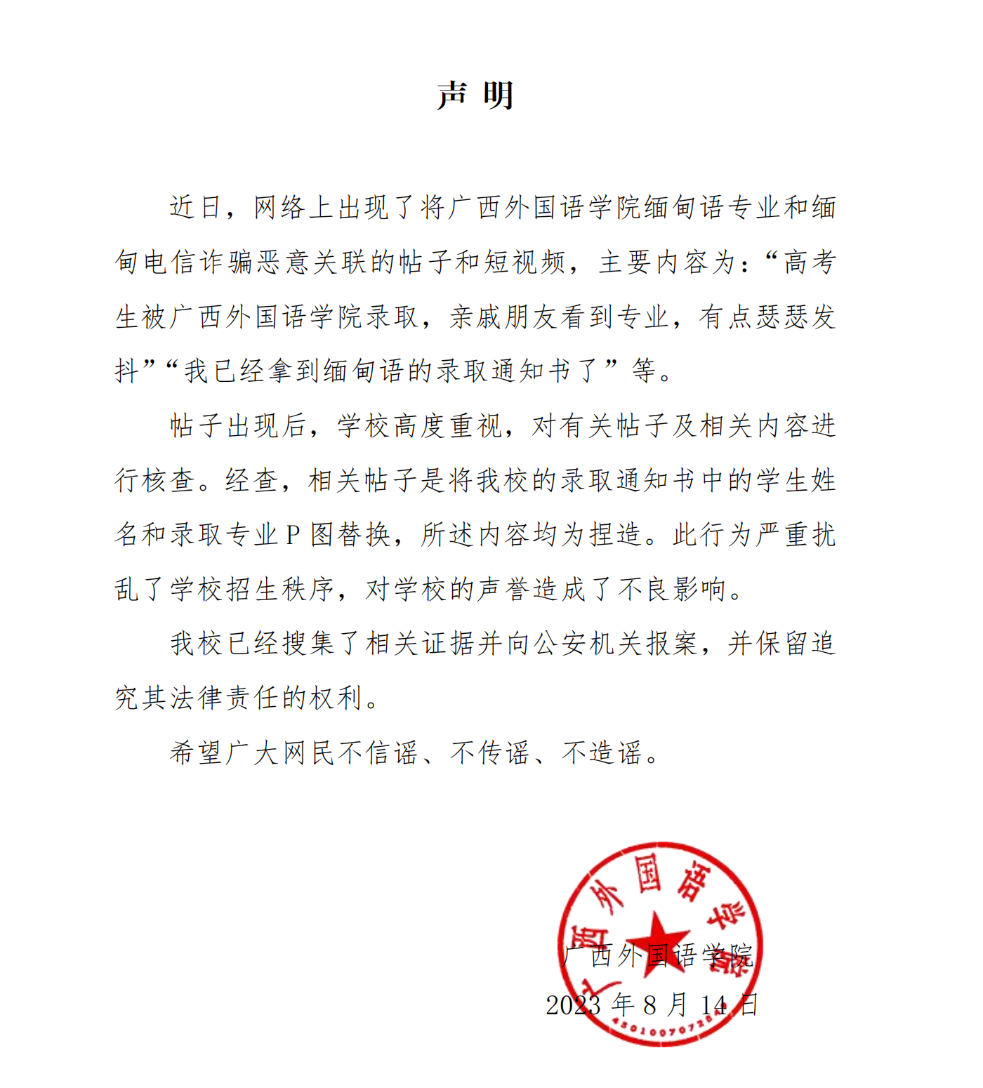 8月14日,@廣西外國(guó)語(yǔ)學(xué)院 官方微博發(fā)布聲明稱(chēng),該帖子是將該校的錄取通知書(shū)中的學(xué)生姓名和錄取專(zhuān)業(yè)P圖替換,所述內(nèi)容均為捏造,已向公安機(jī)關(guān)報(bào)案