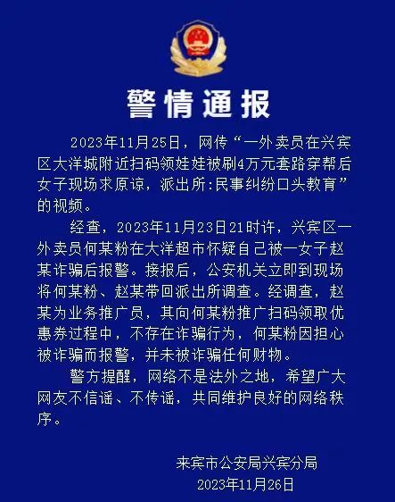 網(wǎng)傳:視頻稱“2023年11月23日21時許,一外賣員在來賓市興賓區(qū)大洋城附近掃碼領(lǐng)取娃娃被刷4萬元套路穿幫后女子現(xiàn)場求原諒,派出所:民事糾紛口頭教育?!?/section>