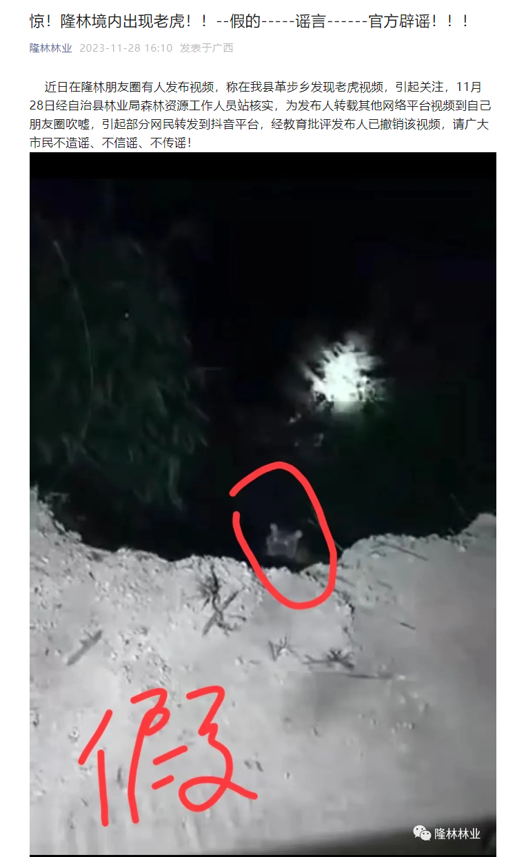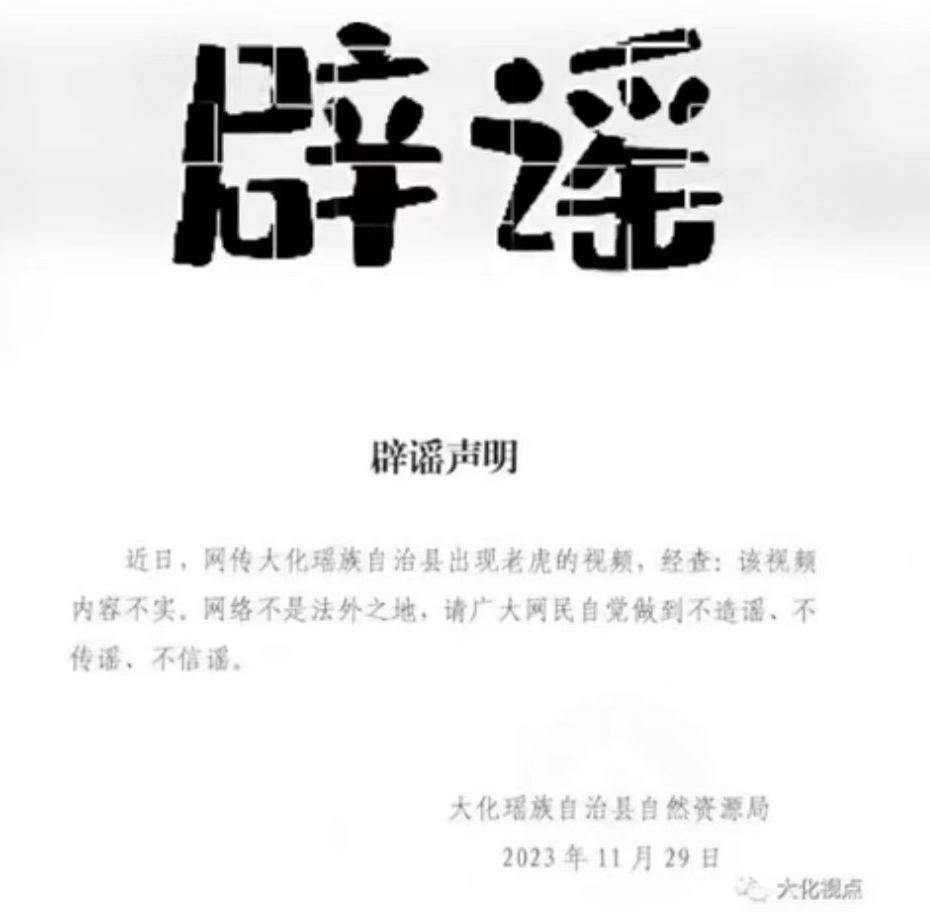 同樣一段視頻,有網(wǎng)民稱是河池大化縣發(fā)現(xiàn)了老虎。對此,大化縣自然資源局及時發(fā)布辟謠聲明,稱網(wǎng)傳信息不實。