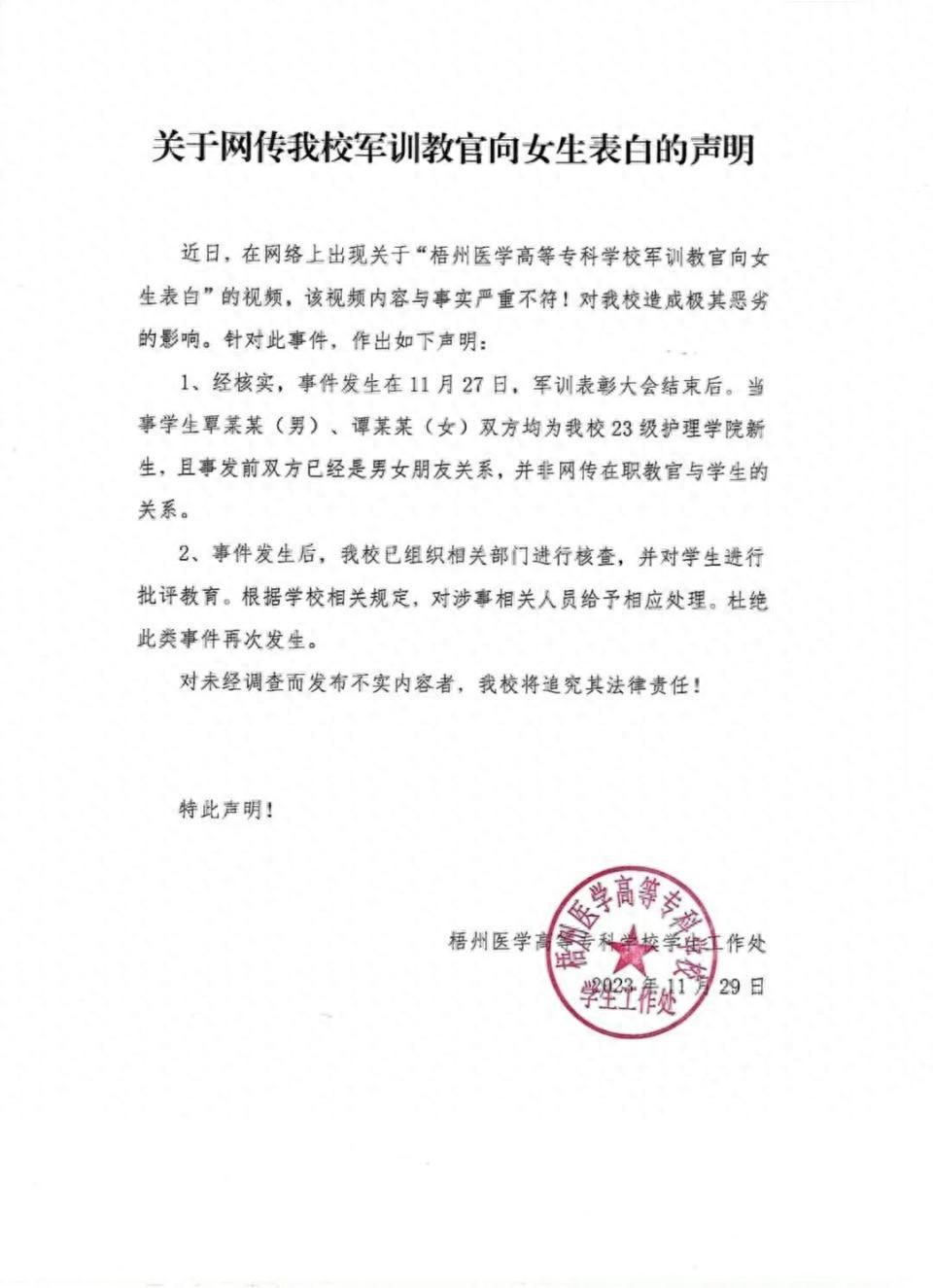 11月29日,梧州醫(yī)學(xué)高等??茖W(xué)校發(fā)布“關(guān)于網(wǎng)傳我校軍訓(xùn)教官向女生表白的聲明”: