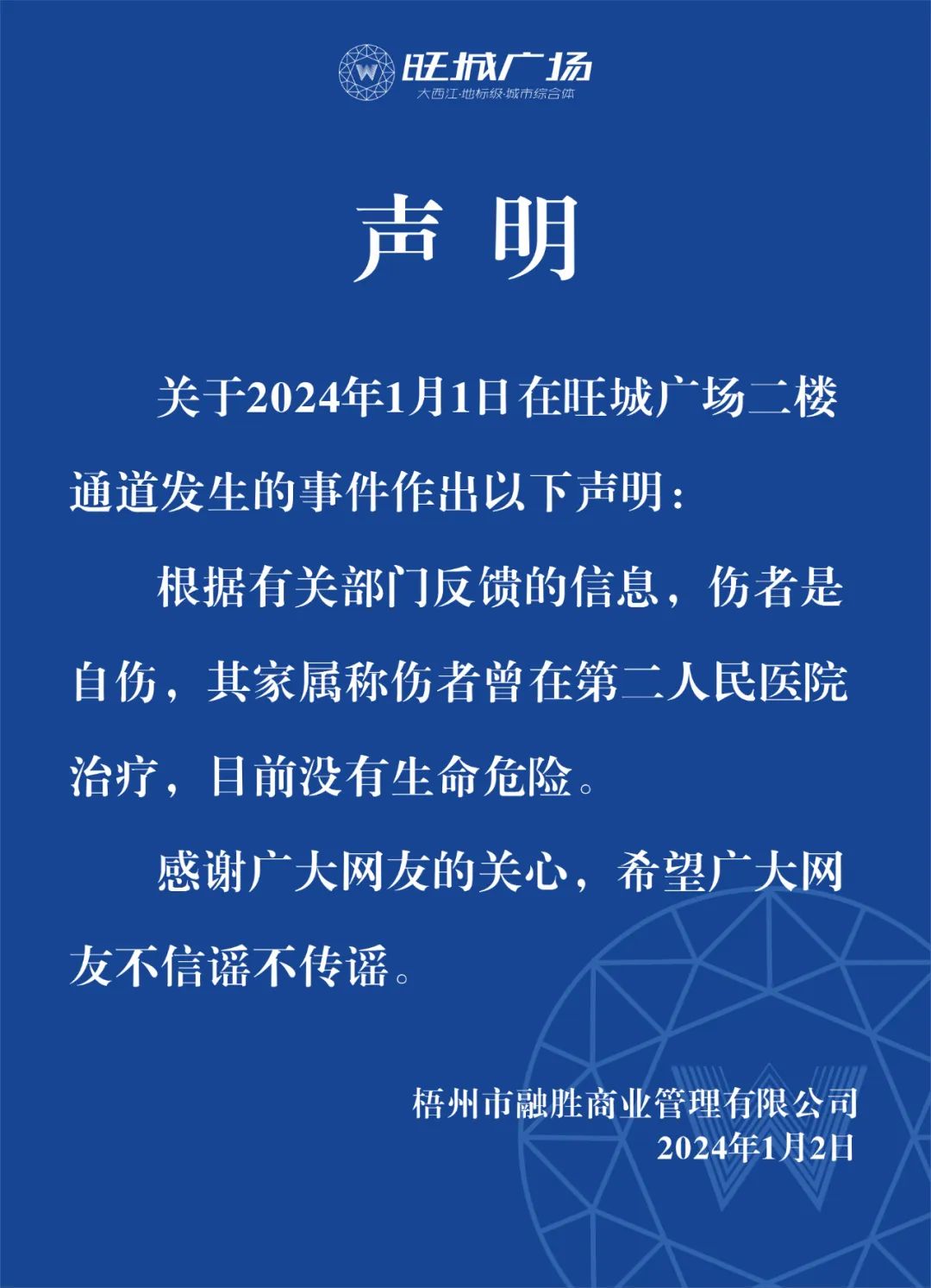 對(duì)此,梧州市融勝商業(yè)管理有限公司發(fā)布聲明稱:根據(jù)有關(guān)部門(mén)反饋的信息,傷者是自傷,其家屬稱傷者曾在第二人民醫(yī)院治療,目前沒(méi)有生命危險(xiǎn)。