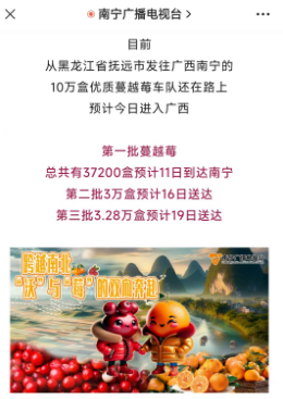 據(jù)南寧廣播電視臺(tái)報(bào)道,從黑龍江省撫遠(yuǎn)市發(fā)往廣西南寧的10萬(wàn)盒優(yōu)質(zhì)蔓越莓車隊(duì)還在路上,第一批蔓越莓預(yù)計(jì)1月11日到達(dá)南寧。