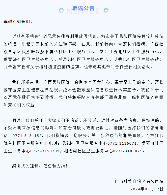 對此,廣西壯族自治區(qū)民族醫(yī)院發(fā)布辟謠聲明,廣西壯族自治區(qū)民族醫(yī)院及下屬各社區(qū)衛(wèi)生服務(wù)中心(站)并未發(fā)布任何關(guān)于接種流腦疫苗的通知,也未與其他部門合作進行相關(guān)活動。
