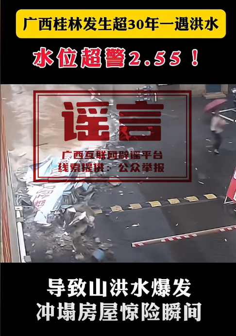 6月21日,有網(wǎng)民在短視頻平臺(tái)發(fā)布視頻,視頻中一圍墻被洪水沖垮,行人匆忙躲避,并配文“廣西桂林發(fā)生超30年一遇洪水”“導(dǎo)致山洪水爆發(fā)沖塌房屋驚險(xiǎn)瞬間”。