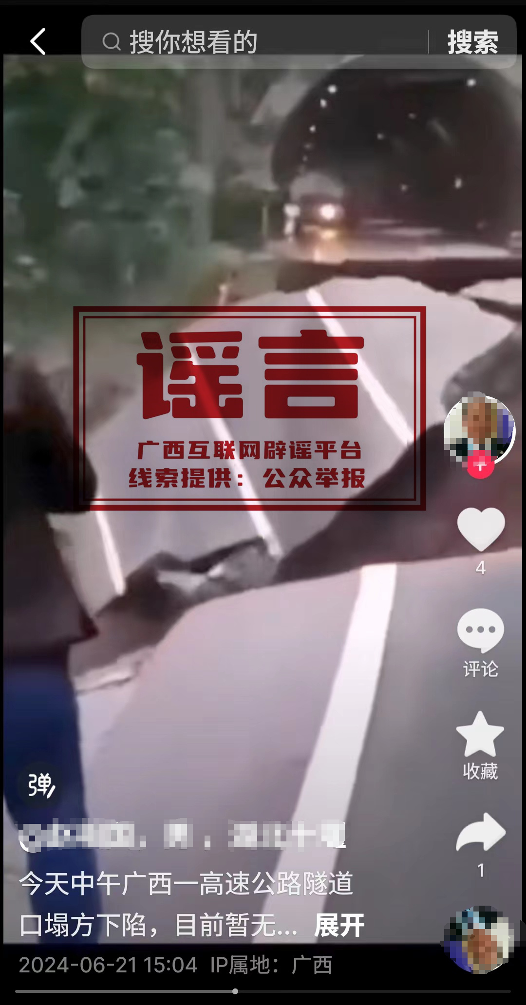 6月21日,有網(wǎng)民在短視頻平臺(tái)發(fā)視頻稱,“今天中午廣西一高速隧道路口塌方下陷,目前暫無(wú)人員傷亡?!?/p>