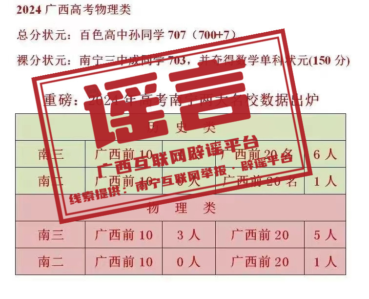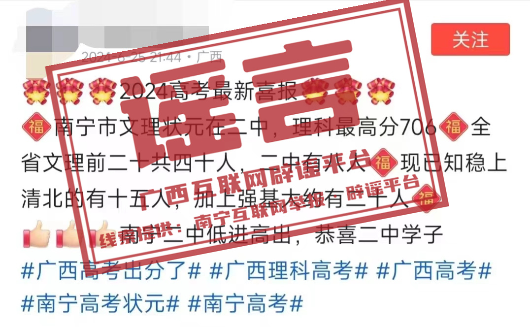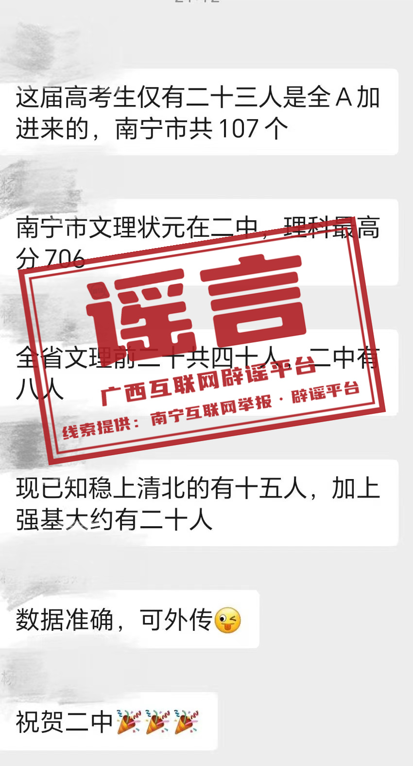 經(jīng)南寧市互聯(lián)網(wǎng)辟謠平臺(tái)核實(shí),南寧市學(xué)校未對外發(fā)布任何高考成績,更未授權(quán)任何部門、媒體或個(gè)人發(fā)布與高考成績相關(guān)的信息。南寧市招生考試院從未發(fā)布過關(guān)于廣西高考狀元的相關(guān)信息,網(wǎng)絡(luò)上涉及南寧市學(xué)校高考成績的帖子或視頻,此類信息均為不實(shí)信息。