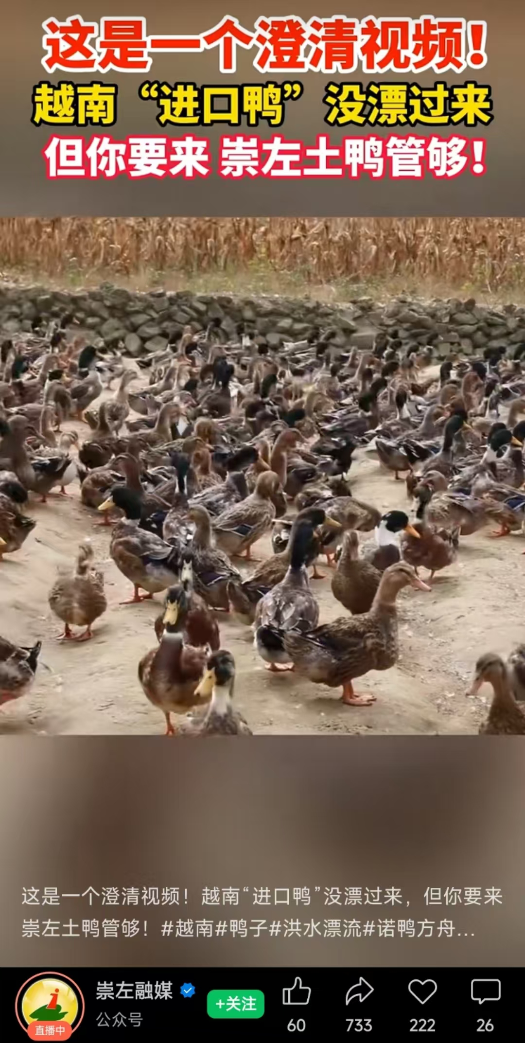 對(duì)此,崇左融媒微信視頻號(hào)發(fā)布澄清視頻表示:越南“進(jìn)口鴨”沒(méi)漂過(guò)來(lái)。網(wǎng)傳越南鴨子隨洪水漂流到廣西崇左情況不實(shí)。