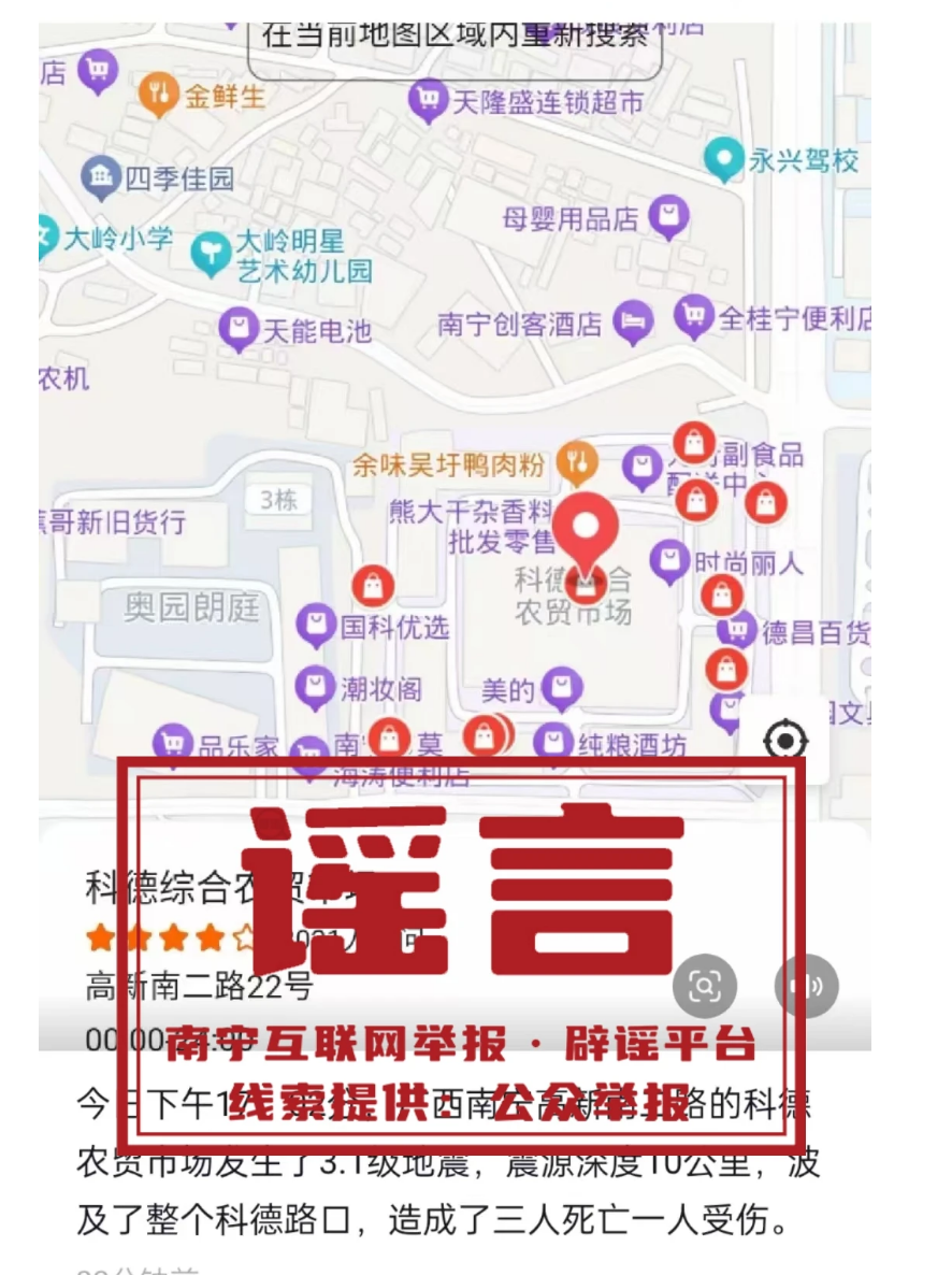 2025年2月12日,公安機關網安部門在工作中發(fā)現,南寧網民韋某為博眼球引流量,在抖音發(fā)布圖片視頻稱“南寧某農貿市場發(fā)生了3.1級地震,震源深度10公里,造成了三人死亡一人受傷”,該信息引起網民關注,造成不良影響。