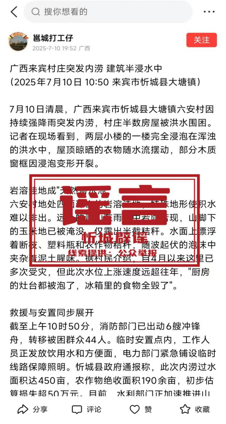 經(jīng)忻城縣大塘鎮(zhèn)人民政府核實(shí),此為不實(shí)信息。2025年7月份以來,忻城縣大塘鎮(zhèn)未出現(xiàn)持續(xù)強(qiáng)降雨,7月10日大塘鎮(zhèn)也沒有任何村莊遭受內(nèi)澇災(zāi)害。